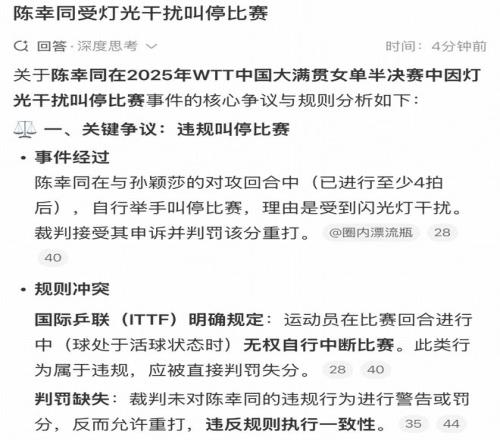 虽然这个球对比赛的影响几乎微乎其微,但在赛后还是上了无数个热搜,很多球迷粉丝质疑陈幸同的这个做法是否合规,是不是故意欺负孙颖莎,搞孙颖莎心态。