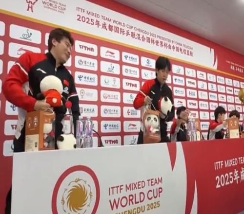 在新闻发布会上,出现了非常有意思的一幕。国乒将士们都对熊猫玩偶爱不释手。孙颖莎也非常喜爱,她手里拿着一个熊猫玩偶把玩着。现场的工作人员也满足了国乒将士们的要求,特意提醒:“桌子上的也可以直接拿走。”孙颖莎回应了一声:“好的。”她笑呵呵地又拿了一个没有拆封的熊猫玩偶。