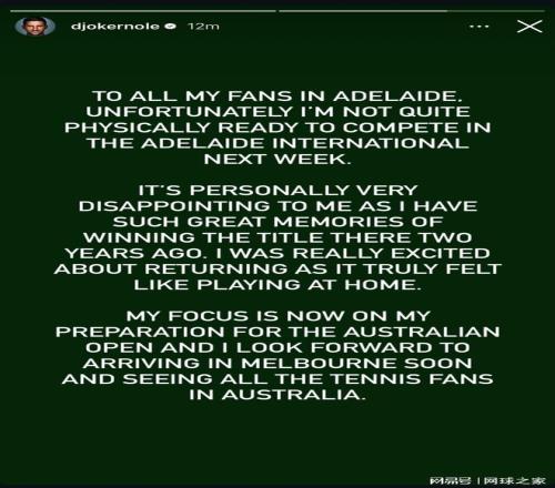 “很遗憾,我的身体状态尚未准备好参加下周的阿德莱德国际赛。 这对我个人而言非常令人失望,因为我对两年前在那里夺冠的经历仍记忆犹新。我原本对重返赛场满怀期待,那里于我而言就像主场一样。 如今我的重心已放在澳网的备战上,我期待很快抵达墨尔本,与澳大利亚所有的网球迷相见。”德约科维奇在声明中坦率地表达了身体状态未达最佳的事实。